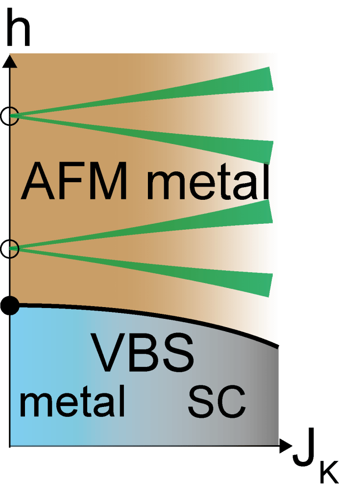 As an example I have studied a 1D spin ladder model with a nonmagnetic valence bond solid (VBS) ground state in the presence of conduction electrons and magnetic field. I have shown that the critical field for the transition is suppressed by Kondo coupling, and novel phenomena, such as SDW gap phase (shown in green) or sign-changing superconductivity may occur. Results of the analytical predictions have been shown to be in excellent agreement with DMRG calculations.
